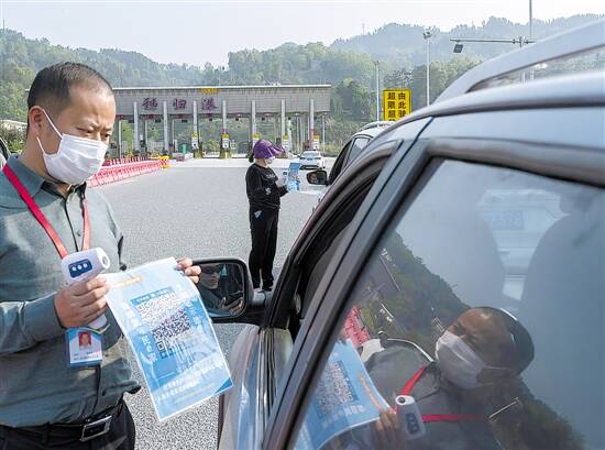 25日,在三峡翻坝高速秭归港收费站检疫点,检疫工作人员指导过往车辆驾乘人员验证健康码。据悉,从25日零时起,湖北省除武汉市以外地区解除离鄂通道管控,有序恢复对外交通,离鄂人员凭湖北健康码“绿码”安全有序流动 新华社发