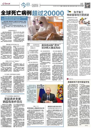 谭德塞表示,目前有150多个国家和地区报告的病例不到100例,这些国家和地区完全可以通过采取积极行动来预防社区传播,以避免像其他国家一样付出沉重的社会和经济代价。“这对许多脆弱的国家尤其重要”,因为如果这些国家出现社区传播并导致病例激增,其卫生系统很可能崩溃。(新华社)