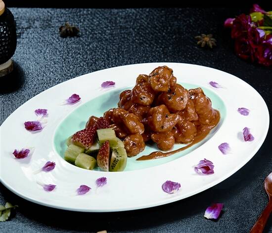 做法:该餐厅的大厨说,把鲜虾裹好生粉放进油锅,慢火炸至金黄色;倒上由炼奶、卡夫酱和番茄酱搅拌而成的酱料拌匀;最后可放上奇异果、小番茄进行装点,咕噜虾就做成了。其口感鲜嫩酸甜,老少皆宜。