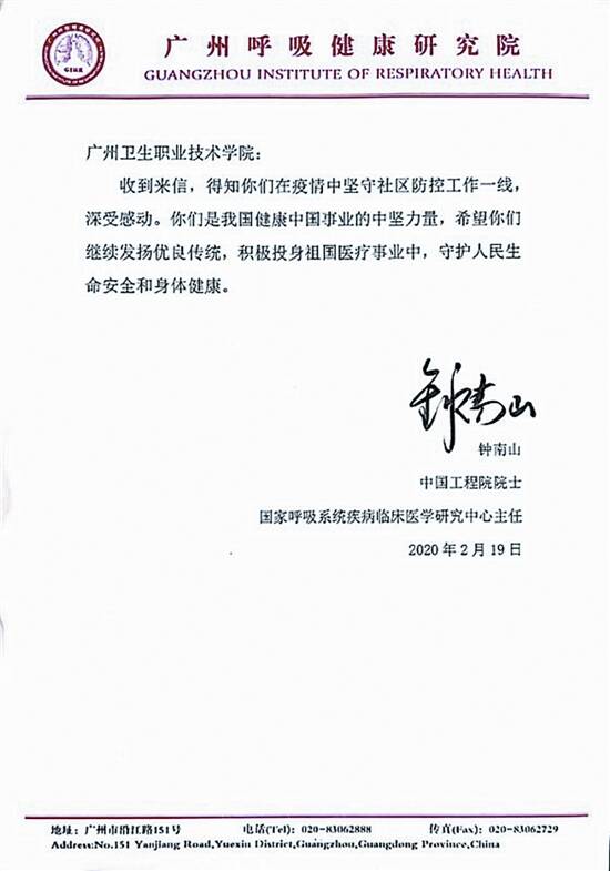 2月15日,为全力支援广州新冠肺炎疫情防控工作,广州卫生职业技术学院紧急组建30人抗击新冠肺炎先锋队,赴海珠区13个社区卫生服务中心协助开展排查和健康服务工作。在此之前,该校已派出两批教职工党员干部共173人次赴海珠区支援。“怀着崇敬的心情,我们写信向钟南山院士汇报了我们参与抗疫的工作。”该院相关负责人说,“没想到百忙中的钟院士,还回信寄语学校师生,为大家加油鼓劲。”回信中,钟南山院士写道:“得知你们在疫情中坚守社区防控工作一线,深受感动。你们是我国健康中国事业的中坚力量,希望你们继续发扬优良传统,积极投身祖国医疗事业中,守护人民生命安全和健康。”