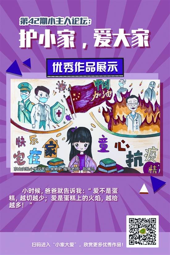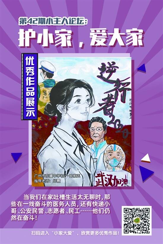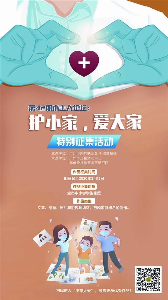 这个特殊的寒假,“宅家”成了全民关键词,人们享受难得的温暖家庭时光。每个家庭的支持正是撑起这个社会的基石,“护”小家才能爱“大家”。2月17日,由广州市妇女联合会、羊城晚报社主办,广州市儿童活动中心、羊城晚报教育发展研究院承办的第42期小主人论坛——“护小家,爱大家”特别征集活动启动。本期小主人论坛采用线上征集形式,通过征集平台给羊城学子提供一个展示自我的机会,引导羊城学子利用短视频、绘画、文章等形式,记录身边英雄的战役故事,为中国加油,并感受和记录不一样的宅家生活。活动旨在引导家长和孩子探索更高质量的陪伴和思考亲子关系,通过缤纷多彩的小家来守护共同的大家。