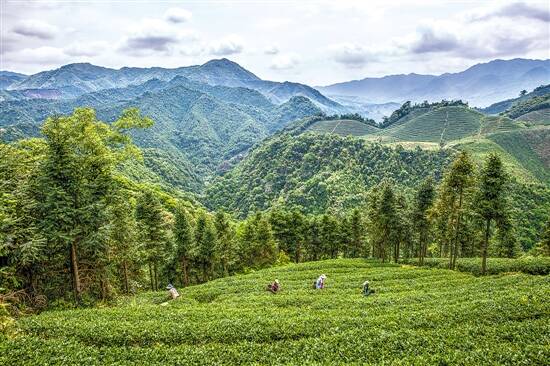 3月25日,记者在始兴县罗坝镇车八岭国家级自然保护区周边的一处茶场看到,一排排茶树排列整齐,从山腰延伸至山顶,茶叶正吐露出嫩绿浅黄的新芽。茶农们则分散穿梭在一垄垄的茶树间,或熟练地从茶树枝头采下春茶,或忙着在茶场里清除杂草、修剪茶枝。