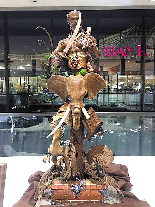 名为“不要让它们离去”的巨型甜品是由巧克力融化进行的造型组装,栩栩如生地展示了一个骑在大象上的背着枪的残忍猎人,手里拿着从大象身上砍下的象牙作装饰品,骄傲暴虐,周围则环绕着其他被猎杀的动物牺牲品。动物背面则是地球的钟表,倒计时寓意着如果人类继续破坏环境、随意猎杀野生动物,地球也必将走向终结。