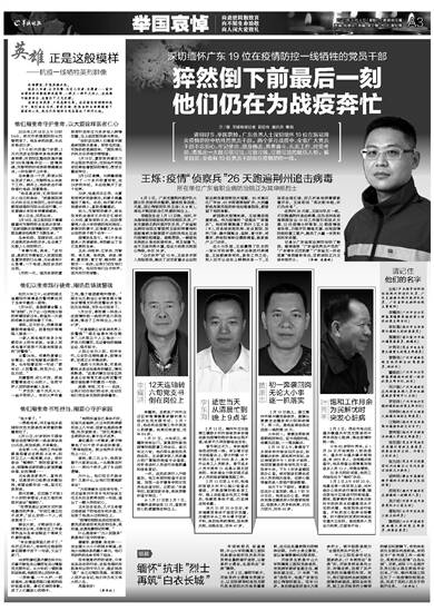 文/图 羊城晚报记者 彭启有 通讯员 粤组清明时节,举国哀悼。广东各界人士深切缅怀19位在新冠肺炎疫情防控中牺牲的党员干部。两个多月战疫中,全省广大党员干部不忘初心、牢记使命,挺身而出、英勇奋斗,扎实工作、经受考验,涌现出一大批可歌可泣、可敬可佩、可赞可颂的模范人物。截至目前,全省有19位党员干部倒在疫情防控一线。