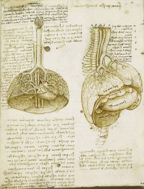 达·芬奇的一个相关展览中,曾公开展出过这位著名科学家的解剖手稿。达·芬奇曾参与解剖了将近20多具尸体,其解剖水平极大地领先于当时他所处的时代,他也是人类历史上第一位把肺的结构图画出来的科学家(如右图)。他画出来的肺非常精巧、精细,是一个由支气管和肺泡组成的器官。可以看出,人们在16世纪时已经知道,肺其实是一个软组织,是支持我们呼吸、交换能量的一个结构。我们的肺部就像一棵倒着长的树——支气管从喉咙下面开口,有23级分支,最终形成了末端上亿的肺泡——我们称之为“呼吸的树状结构”。如此精巧的肺,想要“换一个新的”只怕更是难上加难。