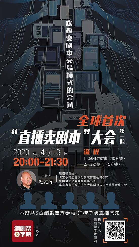 2020年4月3日20∶00,数千名中国影视从业人员推开了同一扇网络直播间的“大门”。这场直播的“卖品”史无前例,主办方“编剧帮学院”将活动称为:全球首次直播卖剧本大会。当晚,共有5名编剧作为直播嘉宾,为超过4500位直播观众推介了自己新创作的原创影视剧本。