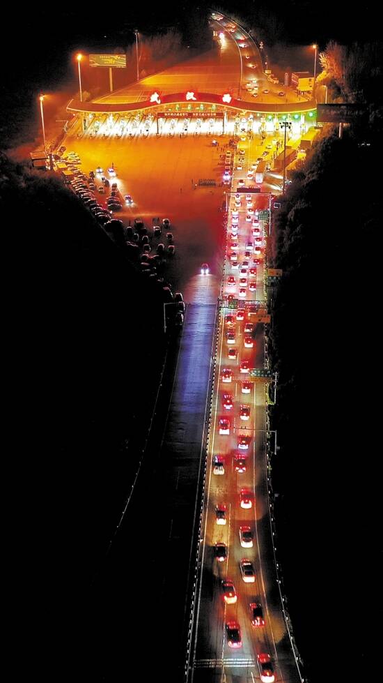 8日零时零分,解除离汉通道管控后(小图),武汉西收费站出城通道排起了长长的车龙(大图) 羊城晚报特派武汉记者 汤铭明 摄
