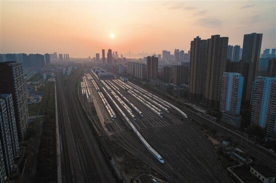 8日,武汉市正式解除离汉离鄂通道管控措施,几十组在武汉动车段经过检修消杀的动车组,犹如“陆地舰队”停靠在存车线上,蓄势待发,重新启程。