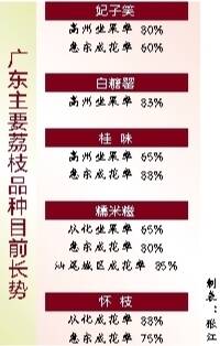 受去年年底干旱、暖冬共同作用,今年荔枝成花率较高,成花提早约15天,预计早熟品种与海南产区上市集中度增加,晚熟与中熟品种上市集中度增加,将迎来收获中的“大年”。最早熟的茂名高州妃子笑、白糖罂,还有茂名电白的妃子笑,或于5月中旬上市,正面“迎战”海南荔枝。到5月下旬,高州桂味、电白白糖罂也将上市;从化的桂味和怀枝、增城的仙进奉、惠东的糯米糍等品种,预计6月接棒上市;最晚成熟的是惠东的怀枝,将在7月上旬上市。