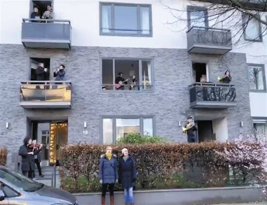 鼓掌是一种形式,而位于汉堡市中心某小区的人们则利用特殊才能来表示自己的态度——因为那里住着北德交响乐团的演奏员们,所以最近的一天,他们在楼上楼下甚至在门口摆开了架势:吹黑管,吹小号,拉小提琴,放声高歌……艺术家们用他们的利器演奏起了贝多芬的《欢乐颂》来。那高亢的音调一时间在整个小区上空飘荡,振奋起被隔离者的情绪,引发寂寞者的回味。