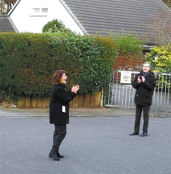 莉丝(左)与邻居在鼓掌