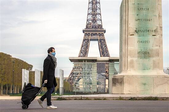 4月7日,在法国巴黎,一名戴口罩的男子外出购物 新华社发