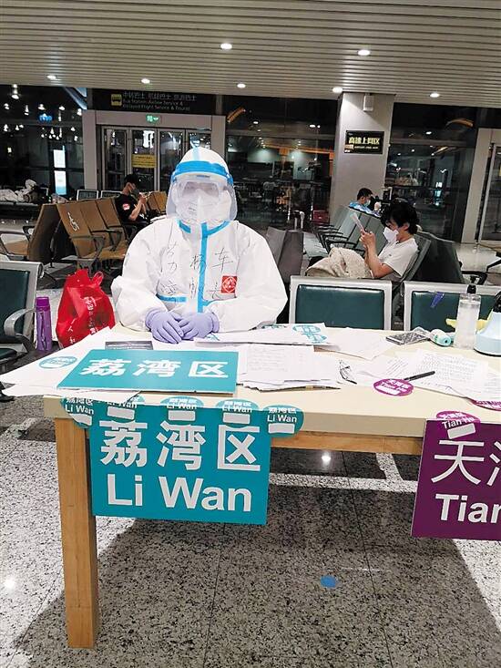 “穿上防护服的一刻,才真正感受到医护人员的不易。”何杰才和杨帆被分在转运组。他们日夜轮值,从为白云机场入境旅客登记信息、测量体温,到安排大巴将旅客运送至隔离酒店及交接,常常工作至深夜。脱下防护服,全身早已汗流浃背。