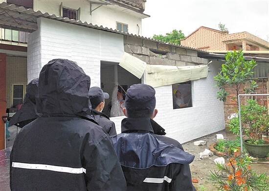在查处过程中,执法人员识破了“旧墙涂装”实乃墙纸,掀开后露出新建的墙壁。穿过这面包裹“旧墙墙纸”的新墙,执法人员还发现现场内部正进行违法建设的其他结构施工,于是迅速叫停现场的抢建行为。