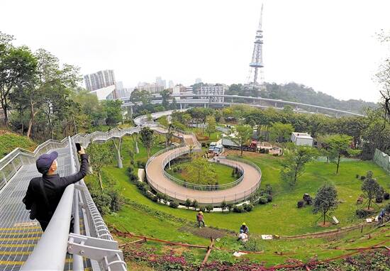4月8日,记者在试开通的云道(越秀公园北门至花果山公园段)看到,云道上有专程而来尝鲜的市民,欣赏越秀山和花果山一带的“双塔绿景”;也有“抄近道”的街坊,利用“云道”通勤。由于云道在花果山附近有一段圆形的引桥设计,正对着越秀山和花果山两座电视塔,不少摄影发烧友利用这段圆形引桥叠加电视塔背景,拍照取景创作。