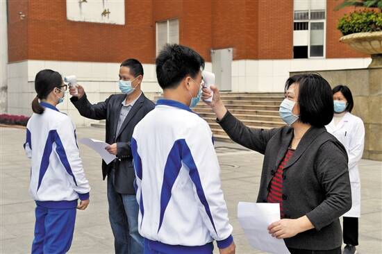 广州市第一中学进行开学复课演练,进入学校的师生都要先量体温 羊城晚报记者 林桂炎 摄