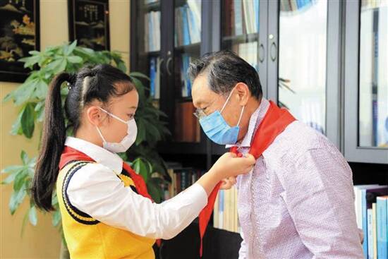 4月10日,4位广东省少先队员代表向中国工程院院士、著名呼吸病学专家钟南山敬献红领巾并赠送手绘画像。钟南山勉励未来小主人,相信科学、尊重科学,勤奋学习、练好基本功,将来报效祖国和人民。