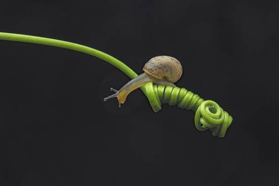 就像这只蜗牛,它爬到了藤蔓的顶端。一圈一圈的藤蔓啊,看起来多像一段乐谱。大自然总是按照它自己的意愿,奏出最美的乐章。此刻,这只孤单的小蜗牛,就像这部乐章里的一个音符,一段旋律;又甚或它把自己想象成了一个乐队指挥,用它的一对触角,指挥着藤蔓、枝叶和微风,来一场草木丛中的大合唱?