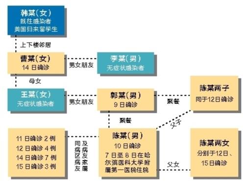 郭某确诊后,4月10日哈尔滨新增的1例确诊病例陈某,为郭某的密切接触者。4月11日新增的2例确诊病例均为陈某的密切接触者(与陈某同在哈医大一院住院)。随后,4月12日新增7例确诊病例(包括陈某的两个儿子和一个女儿,同病区病友及病友家属),4月14日新增8例确诊病例(包括此前为无症状感染者的曹某,同病区病友及病友家属),4月15日新增4例确诊病例(包括陈某的另外一个女儿,同病区病友及病友家属),呈现“链式”传播。