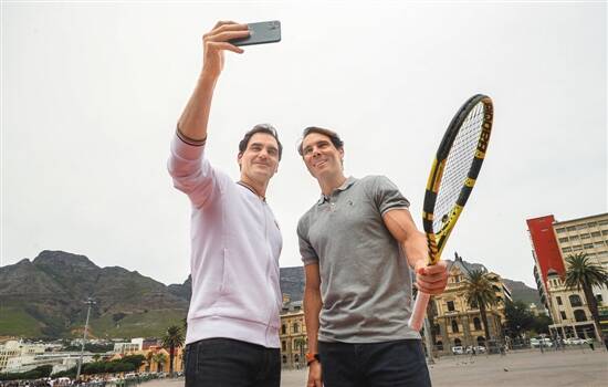 今年南非网球慈善赛赛前预热,费德勒(左)和纳达尔自拍留念 图/视觉中国