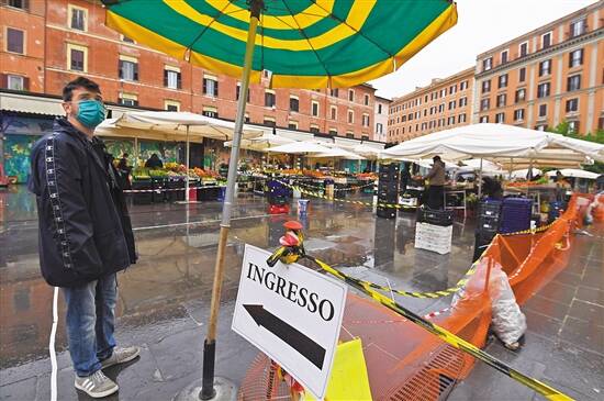 20日,一名戴着口罩的男子在罗马一处露天市场入口维持秩序。当天是意大利疫情暴发以来患者人数首次下降 新华社发