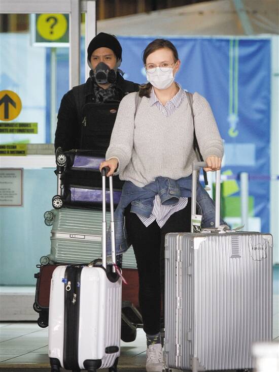 20日,温哥华国际机场到达大厅,人们戴着口罩走过自动门。为应对疫情,加拿大出台新规,即日起在加拿大境内搭乘飞机必须戴上口罩,否则不能继续行程 新华社发