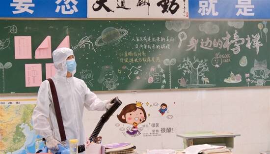 家政服务人员对教室进行全方位消毒 梁栩豪 摄