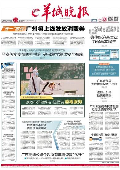 羊城晚报讯 记者周聪、梁栩豪报道:24日,中山大学附属中学迎来了不一样的“家政服务”——“南粤家政”服务人员对校园进行消毒清洁,以迎接学生下周一返校。据悉,受疫情影响,多个家政服务公司“转型”做起消毒服务,助力学校开学和企业复工后的防疫。