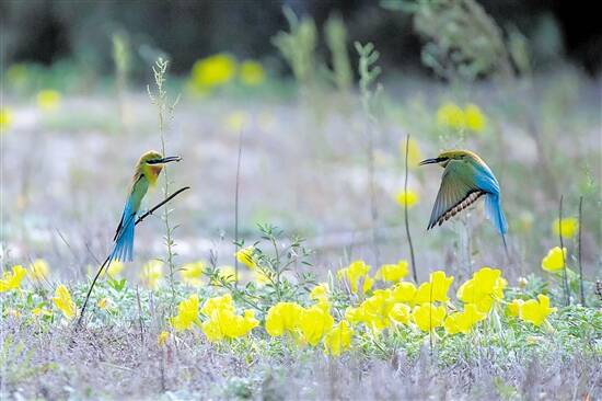 近日,几千只漂亮的栗喉蜂虎飞临广东省饶平县柘林镇金狮湾附近筑巢繁殖,吸引了不少鸟类爱好者带着长枪短炮去拍摄。