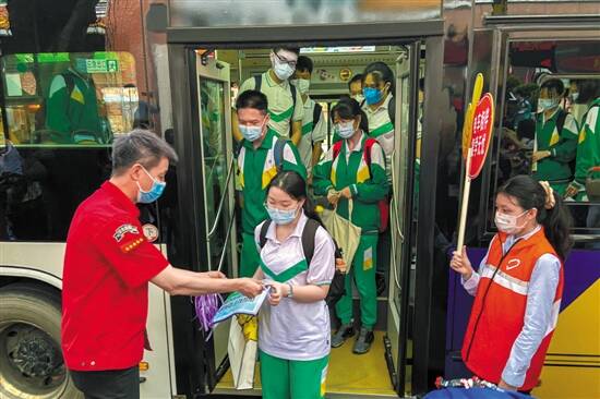 7时15分,“如约助学”专线到达广州市南武中学。看到亲切的学校大门,初三学生陈同学竖起大拇指:“棒!”开学首日,陈同学早上5时40分起床,6时30分准时到达金碧花园门口乘坐专线车。“专线车一趟3元,从家直达学校,车上的同学们也保持距离。”