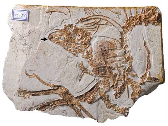 白垩纪早期古鸟类——会鸟的化石标本,黑色箭头标示牙齿位置。(收藏于中科院古脊椎所/李志恒供图)