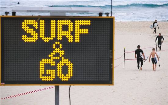 悉尼邦迪海滩有限制开放,28日冲浪爱好者走过沙滩 新华社发