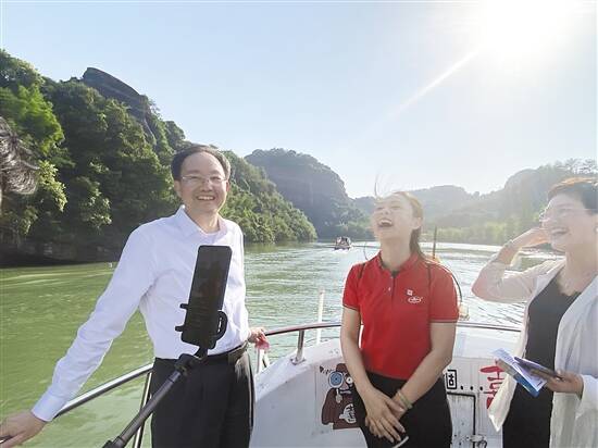 “色若渥丹,灿如明霞,展现出来就是赤壁丹崖,我们韶关的丹霞山更是世界‘丹霞地貌’的命名地。”作为本次“最强主播团”的主力,殷焕明对丹霞风景如数家珍,现场化身金牌导游,为直播间的网友介绍水上丹霞的独特美景。网友纷纷赞叹,“市长简直比专业导游还要专业”“不想当导游的市长不是好主播”。