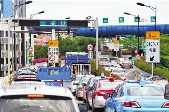 今早10时许,广州机场高速三元里收费站等待缴费的车辆排起“小长龙” 羊城晚报记者 周巍 摄
