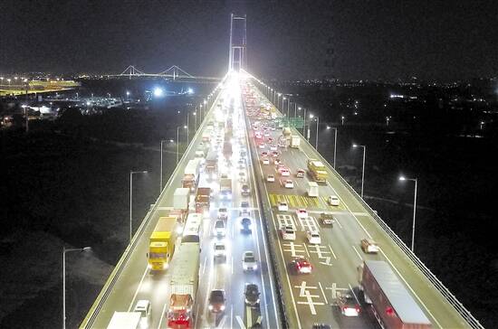 受虎门大桥全封闭影响,昨日,南沙大桥东莞段车流激增,车行缓慢 羊城晚报记者 王俊伟 摄