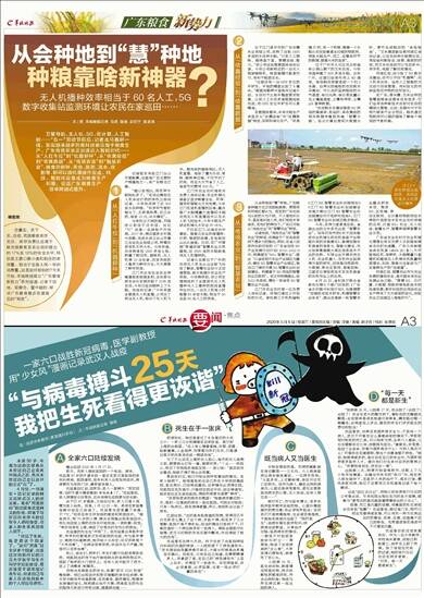卫星导航、无人机、5G、云计算、人工智能……“五一”劳动节前后,记者走马春耕一线,发现越来越多的高科技被应用于粮食生产。广东传统农业正加速迈入智能时代——从“人扛牛拉”到“机器耕种”,从“依靠经验”到“依靠数据”,从“传统农业”到“智慧农业”,粮食的耕种、杀虫、施肥、浇水、收割等,都可以由机器操作完成。科技、智能化设备成为粮食生产利器,促进广东粮食生产效率跨越式提升。
