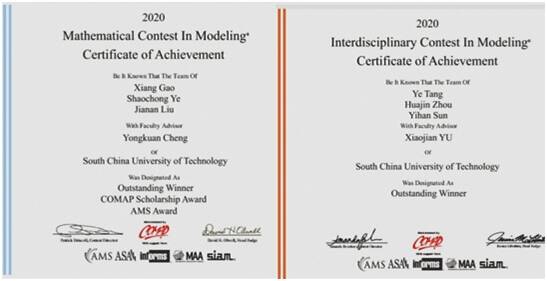羊城晚报讯 记者陈亮,通讯员丁为建、赵春旭报道:近日,2020年美国大学生数学建模竞赛和交叉学科建模竞赛(MCM/ICM)成绩揭晓,华南理工大学获得大赛最高奖项Outstanding Winner两项,获奖数量居全球第二。其中,高翔、叶绍崇、刘健安组成的队伍(指导教师:程永宽)以世界第一名的好成绩,额外获得了冠名奖COMAP Scholarship Award。