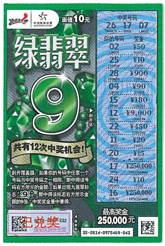 体彩顶呱刮经典老票“绿翡翠”再送头奖。近日,一位幸运儿现身中山市体彩中心,凭借一张顶呱刮“绿翡翠”彩票,领走了25万元大奖。