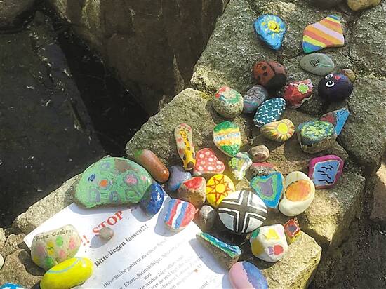 那里还压了一张告示:“止步!请让这些石头待在这里!”接下来还写道:“这属于一个游戏。亲爱的孩子们、父母们、石头收集者们、散步的人们以及所有对一个美丽的主意保持开明态度的人们,你们在家里画一个石头,然后跟我们的放在一块儿,接下去大家看看,我们是否能在这个艰难的疫情期间,用彩色的石头妆点好这个阿尔斯特湖的源头。幻想是没有界限的!祝大家快乐,并保持健康!”
