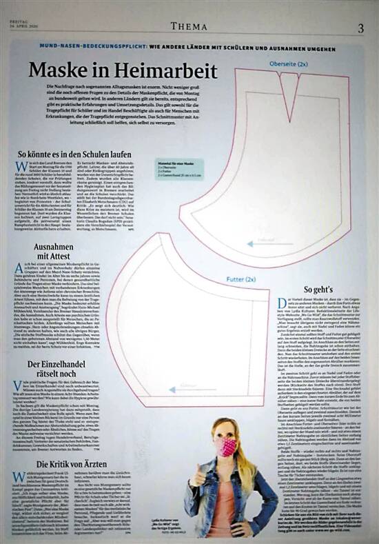 4月28日的《不莱梅邮报》还介绍了一位名叫穆勒的女士。这位女士曾是有76名成员“好女士”合唱团的创始人,因为疫情歌唱家们无法举办音乐会。有一天穆勒女士突然就有了一个项目设想:组织其中的12位愿意参加这个项目的合唱团成员、一起缝制口罩以代替音乐活动。她说:“我们想做一些有用的事,能帮助别人的事,给那些自己不会缝制的人们提供口罩。”