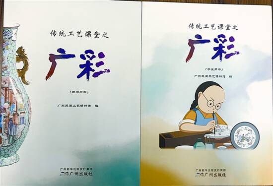 同时,为了提高学校参与性,为学校提供课程设计、课程资源,该馆编写出版了《传统工艺进课堂》之广彩、广绣、剪纸校本教材,包含教师用书、学生用书、教师资源卡、学生学习卡,还有动漫视频、多媒体游戏,“教材内容丰富,形式多样,这样老师教得轻松,学生学得有趣”。依托教材,围绕着培训老师、为学校送展、举办研学活动、为学生举办作品展等开展了一系列馆校合作,“希望将传统工艺进校园持续、深入地推进”。