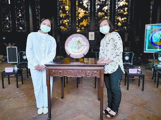 中国工艺美术大师、广东省非物质文化遗产广彩技艺传承人翟惠玲以朱海秀为原型创作了广彩作品《青春之光》,近日,她把作品捐献给广东民间工艺博物馆(陈家祠),并与作品主角朱海秀“同框”。