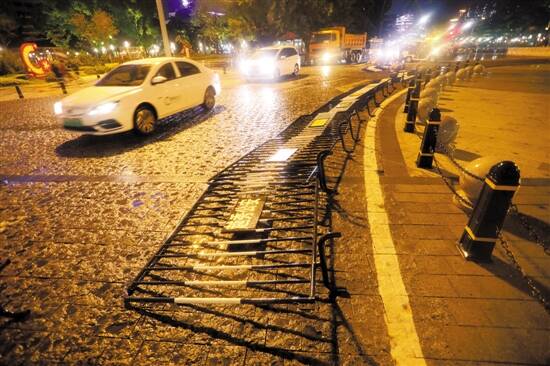 21时30分,记者在越秀区海珠广场看到,广场东侧的侨光路实施交通管制,一棵大树倒下,绿化抢险工人正在对倒下的大树进行切割。步行进入广场,记者发现广场东侧用于分隔车行道和人行道的护栏大批倒下,据广场旁广州宾馆工作人员反映,当晚海珠广场空旷地方非常大风,护栏和大树皆因强风而倒。