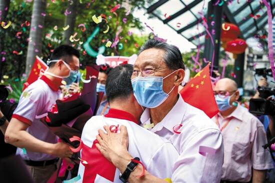 钟南山院士拥抱驰援伊拉克回院的医生 羊城晚报记者 梁喻 摄