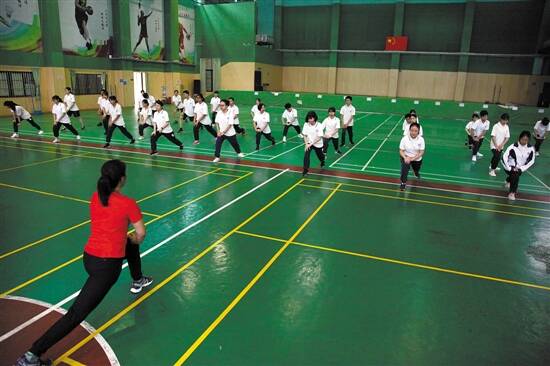 天河中学学生在室内体育馆进行体能预热训练 羊城晚报记者 宋金峪 摄