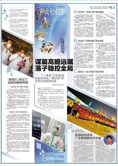 其三,疫情防控高度谱写了广东精神的新时代华章。2003年抗击“非典”后,广东就提炼出“临危不惧,沉着应对;实事求是,尊重科学;无私奉献,顽强拼搏;万众一心,敢于胜利”的“抗非”精神,这种精神在今天抗击新冠肺炎疫情中再度展现。钟南山院士以83岁的高龄,接到疫情防控命令后连夜赶赴武汉;青年医生王烁,在26天里跑遍了荆州,为医疗队精准支援荆州疫情防控和复工复产工作提供了大量一手资料和科学依据……他们共同以“最美逆行者”形象,谱写出新时代广东精神新华章。
