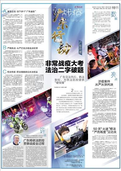 在疫情防控阻击战中,广东立法先行、执法必严、违法必究、推动全民守法、汇聚全民依法防控合力。广东的依法防控既立足本地实际,又着眼长远、聚焦问题,富有针对性和可操作性,依法防控已经成为党政机关、各地各部门的共同行为准则。