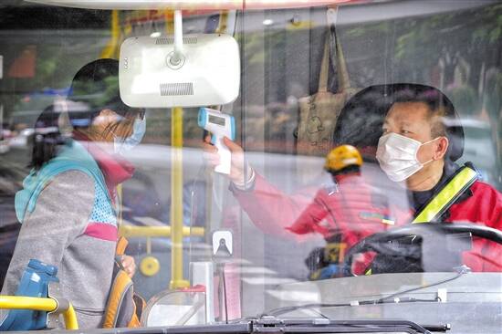 公交车司机为乘客测体温 羊城晚报记者 陈秋明 摄