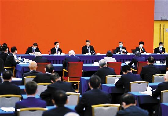 23日上午,习近平看望参加全国政协十三届三次会议的经济界委员,并参加联组会,听取意见和建议。汪洋参加看望和讨论 新华社发