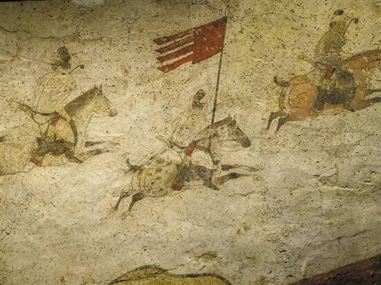 《狩猎出行图》 《狩猎出行图》出土于章怀太子墓,高200厘米、长900厘米。原图在揭取时被分割为数幅,本图是其中的一幅。 这是一幅气势磅礴、宏伟壮观的作品。画师将皇家贵族外出狩猎的不凡阵势表现得淋漓尽致。画中旗帜飘动,四十多位侍从马鞭高扬、弓箭晃动,簇拥着骑在白马上的主人奔赴猎场。殿后的还有两匹辎重骆驼。这幅千年前绘制的唐墓壁画,发掘出土虽已达半个世纪,但至今仍色彩鲜艳,实属唐墓壁画中不可多得的上乘之作。